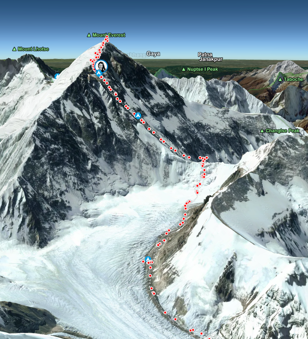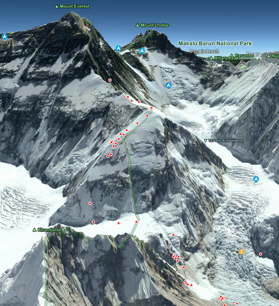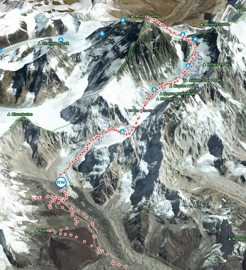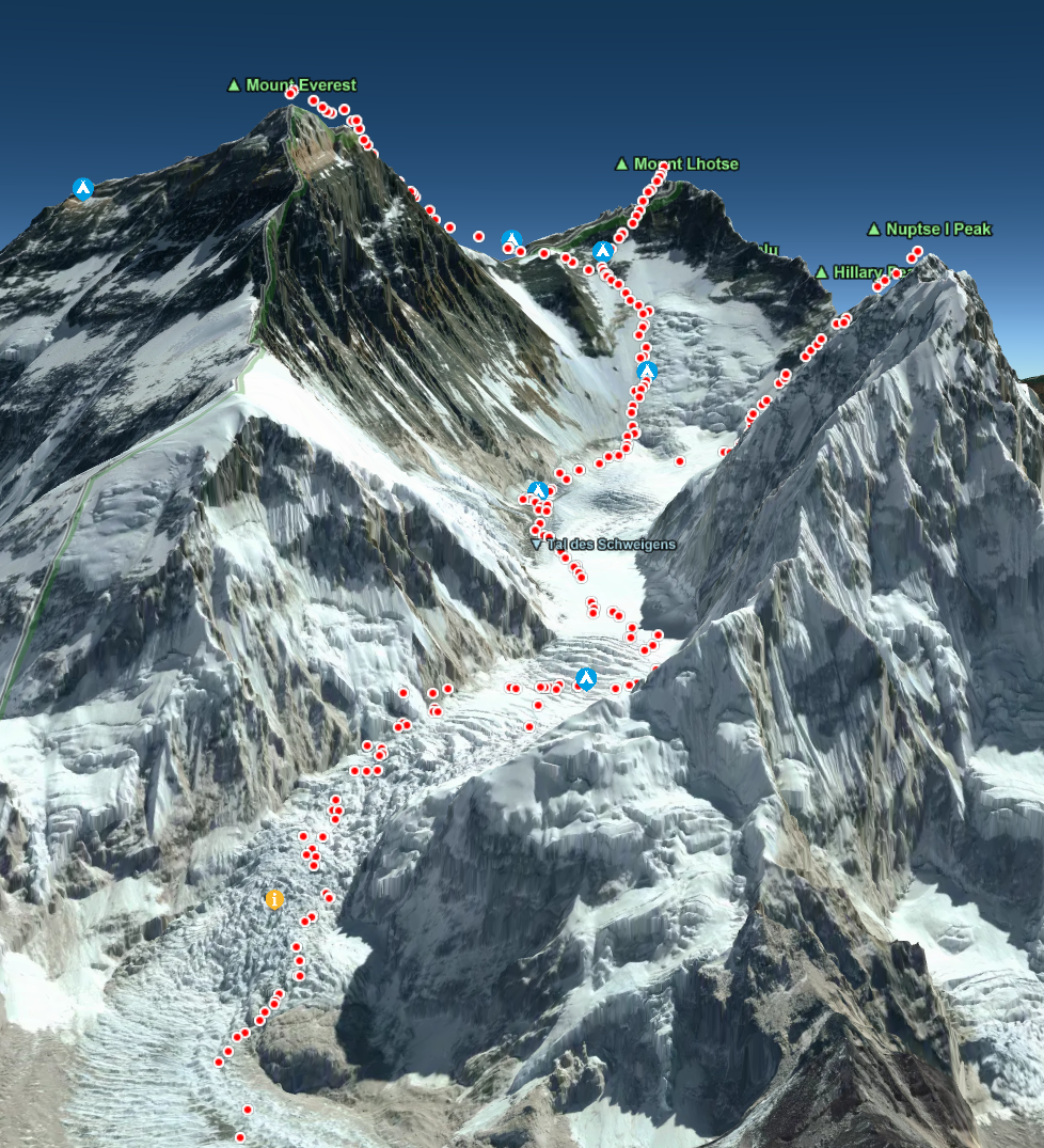 Hier zum Beispiel der großartige Erfolg von Jay Whiting am Mount Everest. Jay ist ein britischer Bergsteiger, der jüngst in der Himalaya-Bergsteigerszene besondere Anerkennung gefunden hat. Im Frühjahr 2025 schrieb er Geschichte, als er der jüngste Brite wurde, der die prestigeträchtige „Everest Triple Crown“ in einer Saison absolvierte – das bedeutet, er bestieg Nuptse (7.861 m), Lhotse (8.516 m) und Everest (8.848 m) nacheinander innerhalb weniger Wochen Mit seinem Garmin InReach GPS hat er seine Routen aufgezeichnet, seine aktuelle Position war in Echtzeit in unserer 3D-Karte sofort sichtbar. So waren seine Freunde und Fans live dabei. Und er hat damit einen zweifelsfreien, sichtbaren Nachweis, dass er seine Ziele erreicht hat!
