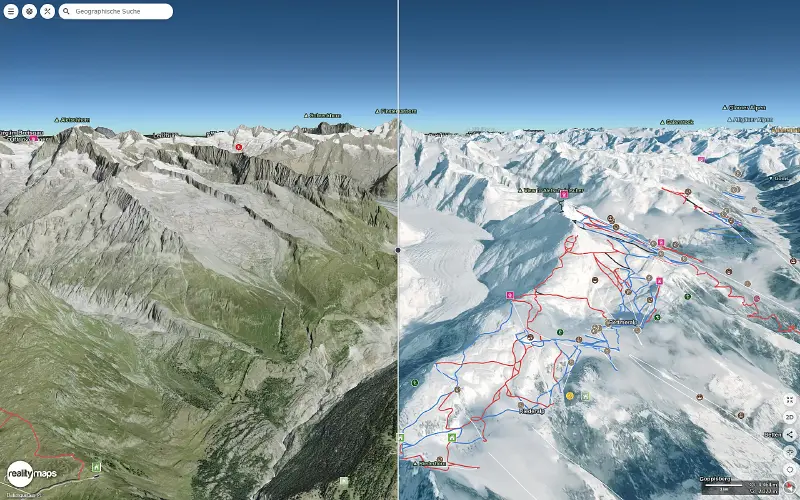 Ein direkter Vergleich in der 3D-Karte zwischen schneefreiem Sommergelände und verschneiter Winterlandschaft. Diese Funktion ist besonders hilfreich, um Geländestrukturen und Gefahrenstellen besser einzuschätzen.