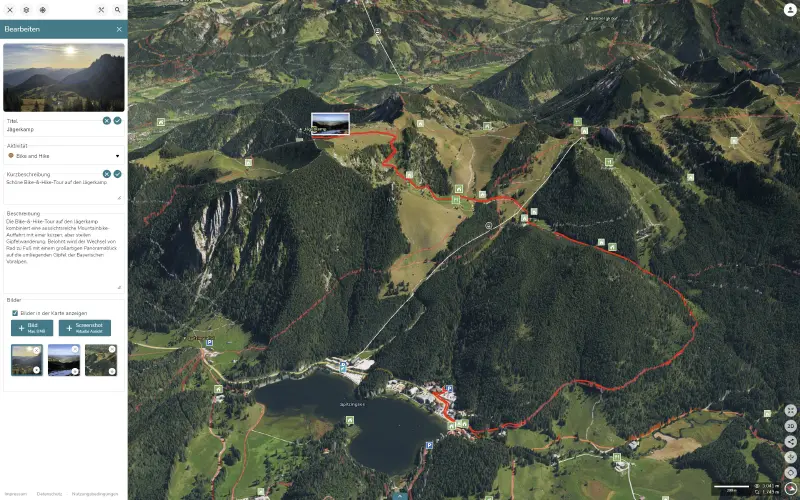 Editiere die Informationen zu deiner Tour: Ändere den Titel, füge ein Kurzbeschreibung und eine ausführliche Beschreibung hinzu. Du kannst auch die Aktivität deiner Tour ändern und Fotos hinzufügen oder löschen. Speichere im Tourenplaner direkt einen Screenshot aus der 3D Karte als Foto der Tour. Außerdem kannst du das Titelbild der Tour festlegen.