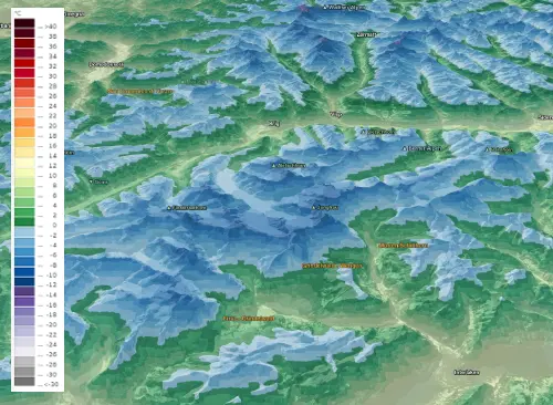 Vorhersage von Neuschnee, Schneebedeckung, Wind Temperatur & Sonnenschein-dauer für bis zu 72 Stunden für die Alpen.